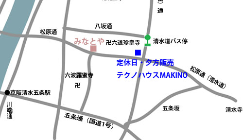 六波羅蜜寺より 徒歩 2分 清水道バス停より 徒歩 6分 京阪清水五条駅より 徒歩10分 清水寺より 徒歩10分 (GoogleMap) |